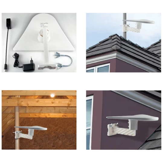 Vanjska antena sa pojačalom, frekventni opseg 87.5 - 230 MHz / 470 - 862 MHz, UHF/VHF, max. pojačanje do 56 dB, impedanca 75 Ω, dimenzije 320 x 30 x 230 mm. Napajanje 230 V ~ / 50 Hz, optimizirana za DVB-T / T2 prijam, montaža na zid ili nosač ( cijev )