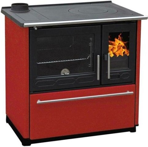 Štednjak na drva u crvenoj boji, s priključkom na dimnjak S lijeve strane.