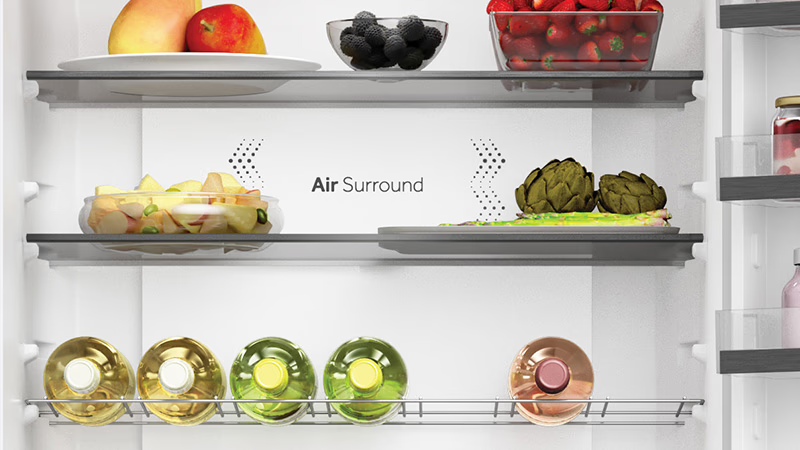 Uz Haier Air Surround napredan sustav zračnih otvora na više razina, smještenih s bočne strane unutrašnjosti hladnjaka, osigurana je ravnomjerna raspodjela hladnog zraka - uz manje temperaturnih oscilacija, isušivanje namirnica svedeno je na minimum te one dulje zadržavaju izvornu svježinu, aromu i okus - do 99% nakon 7 dana u usporedbi s prvim danom.