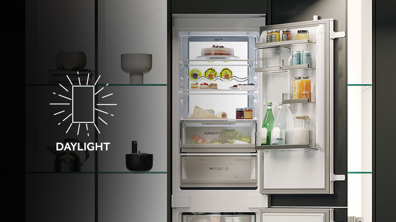 Sustav rasvjete Haier ID Titanium Series 6 uključuje Daylight rasvjetu unutar hladnjaka i zamrzivača* za poboljšanu vidljivost. Uz Daylight, svaka polica i kut vašeg hladnjaka savršeno su osvijetljeni, osiguravajući da nijedna namirnica ne prođe nezapaženo. Punjenje i organizacija hladnjaka postaju jednostavni zahvaljujući jačem osvjetljenju, što olakšava slaganje namirnica točno tamo gdje ih želite.Poboljšana vidljivost seže i do zamrzivača*, čineći pronalaženje smrznutih namirnica jednostavnim zadatkom. *Dostupno samo na odabranim modelima.