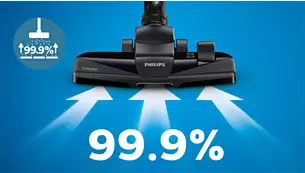 Uživajte u kvalitetnijem zraku kod kuće zahvaljujući našem filtru HEPA koji hvata > 99,99 %* peludi, dlaka kućnih ljubimaca, grinja i drugih sitnih čestica prašine u spremnik, stvarajući zdravije okruženje za osobe s alergijama.