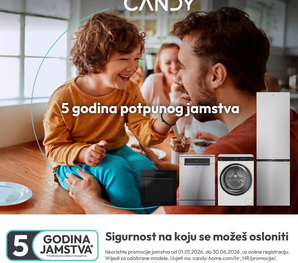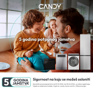 2 godine osnovnog + 3 godina produženog potpunog jamstva vrijedi za CANDY uređaje bijele tehnike (samostojeće i ugradbene) kupljene u periodu od 01.01.2026. do 30.06.2026. godine, uz OBAVEZNU online registraciju.