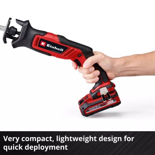 Einhell akumulatorska univerzalna pila TE-AP 18/13 Li-Solo posebno je lagana i praktična pila za jednostavno korištenje između - bez obzira je li u domu ili vrtu. Klipna pila dio je obitelji Einhell Power X-Change i može se kombinirati sa svim baterijama i uređajima za punjenje iz obitelji sustava. Zbog svoje male težine i ergonomskog, kompaktnog dizajna, klipna pila je prikladna i za rad jednom rukom. Zahvaljujući posebnoj mekanoj površini, sigurno leži u vašoj ruci. Snaga se može optimalno prilagoditi različitim materijalima i odgovarajućoj primjeni pomoću brzinske elektronike. Akumulatorska klizna pila radi s visinom hoda od 13 mm i postiže učinak rezanja do 50 mm u drvu i 4 mm u čeliku. List pile se može brzo i bez alata zamijeniti i umetnuti u držač lista pile 0,6 - 1,6 mm. Za optimalno korištenje lista pile, papuča pile se može točno namjestiti pomoću nasadnog šesterokutnog ključa koji je pohranjen i isporučen u kućištu. Sigurnost pri korištenju osigurava blokada uključivanja i meki start koji dodatno štiti motor pile. Akumulatorska univerzalna pila TE-AP 18/13 Li-Solo isporučuje se bez baterije i punjača. Oni su dostupni zasebno, na primjer u praktičnom početnom setu.
